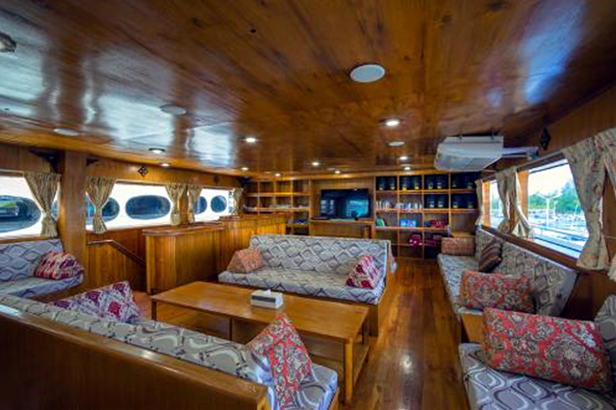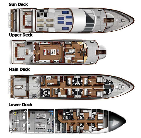4 cabins with bunk beds located on the upper and lower deck. Wth air-con, a separate bathroom with a hot shower.