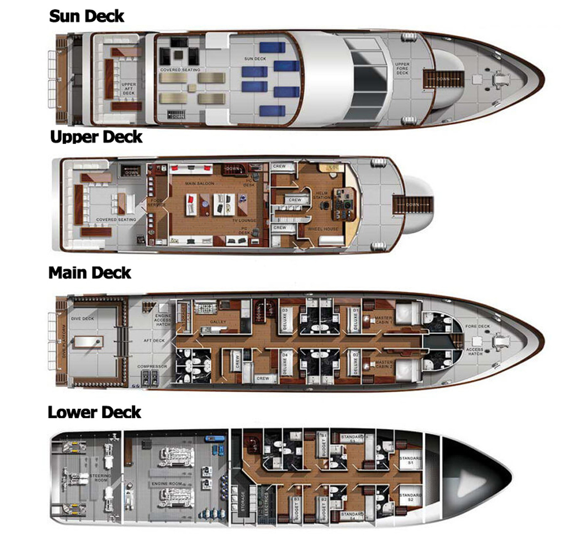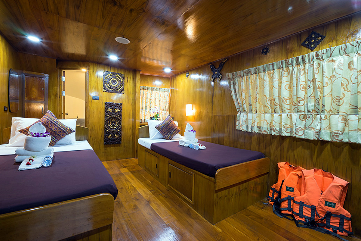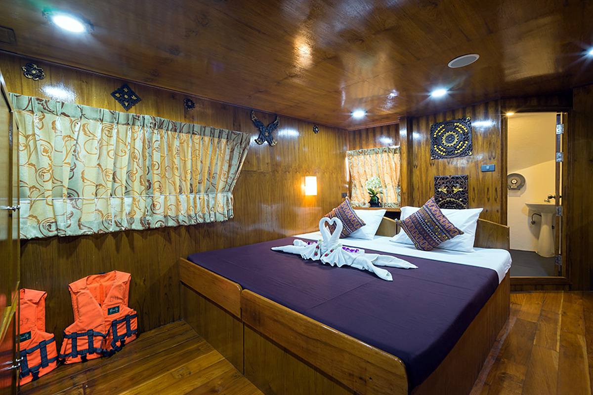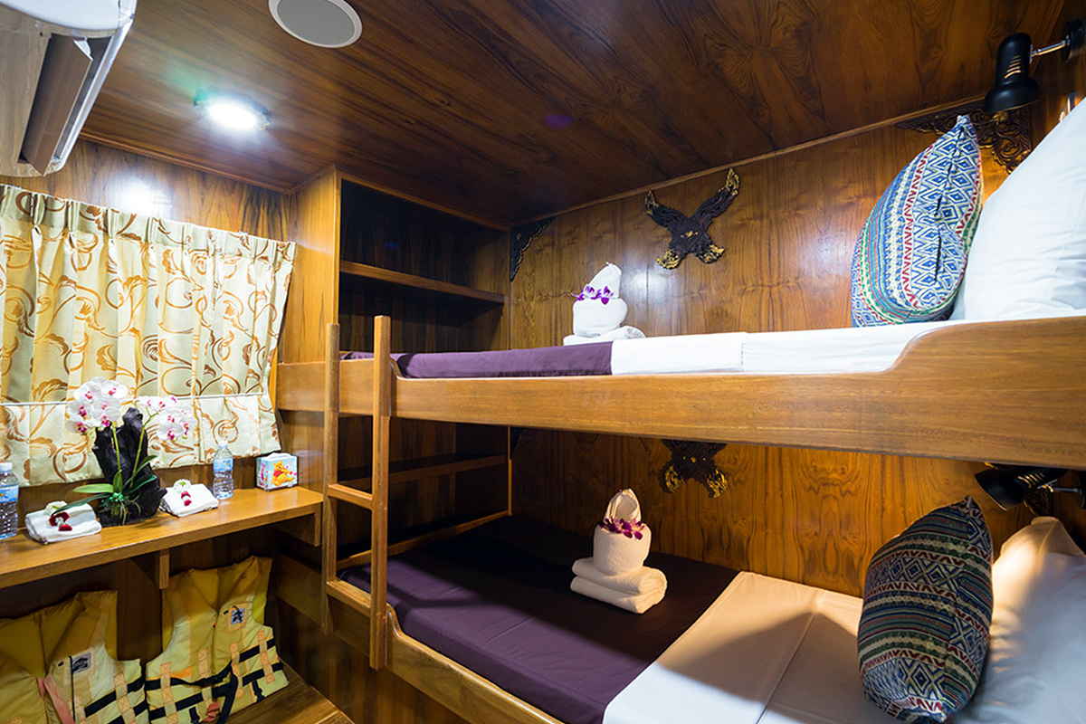4 cabins with bunk beds located on the upper and lower deck. Wth air-con, a separate bathroom with a hot shower.