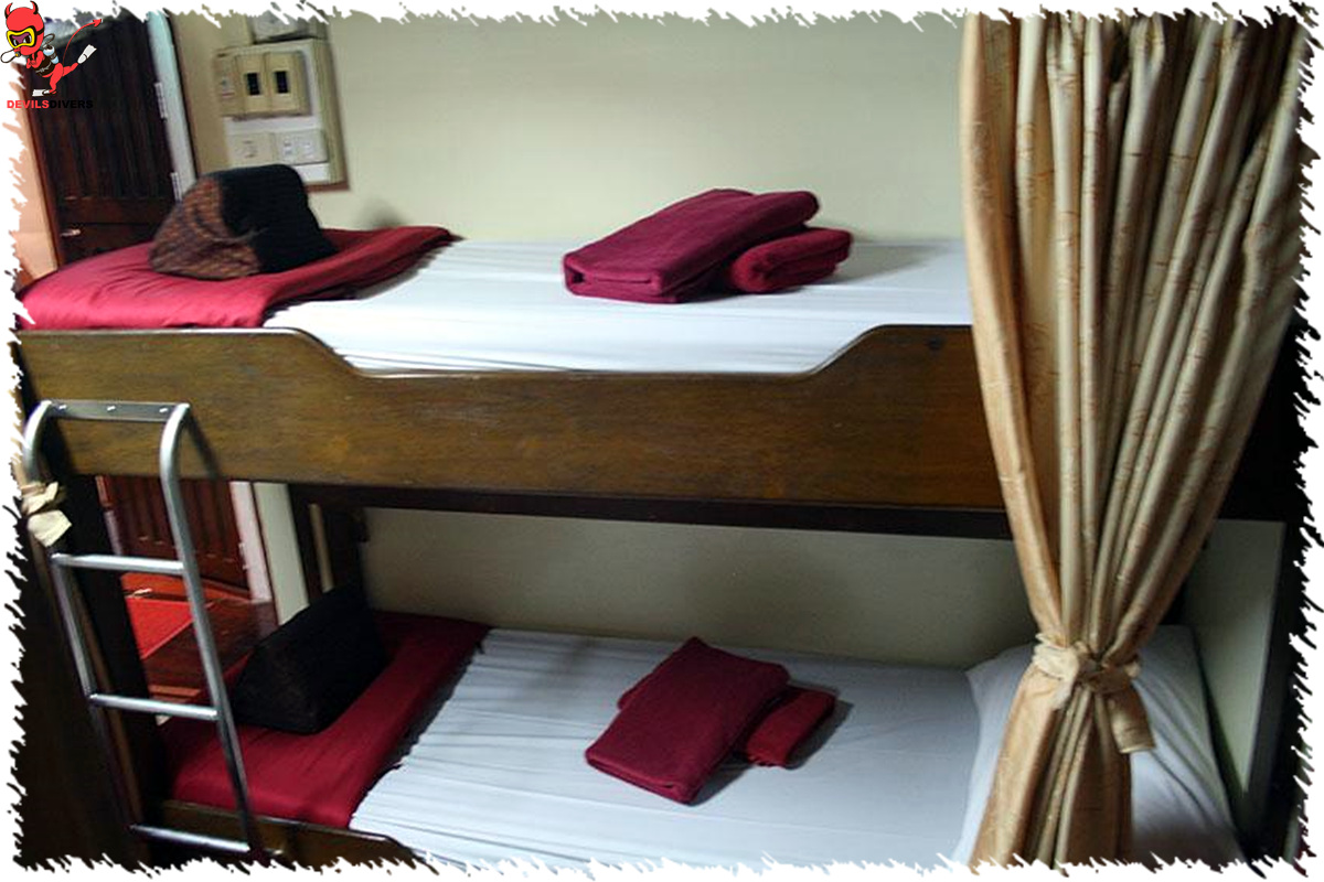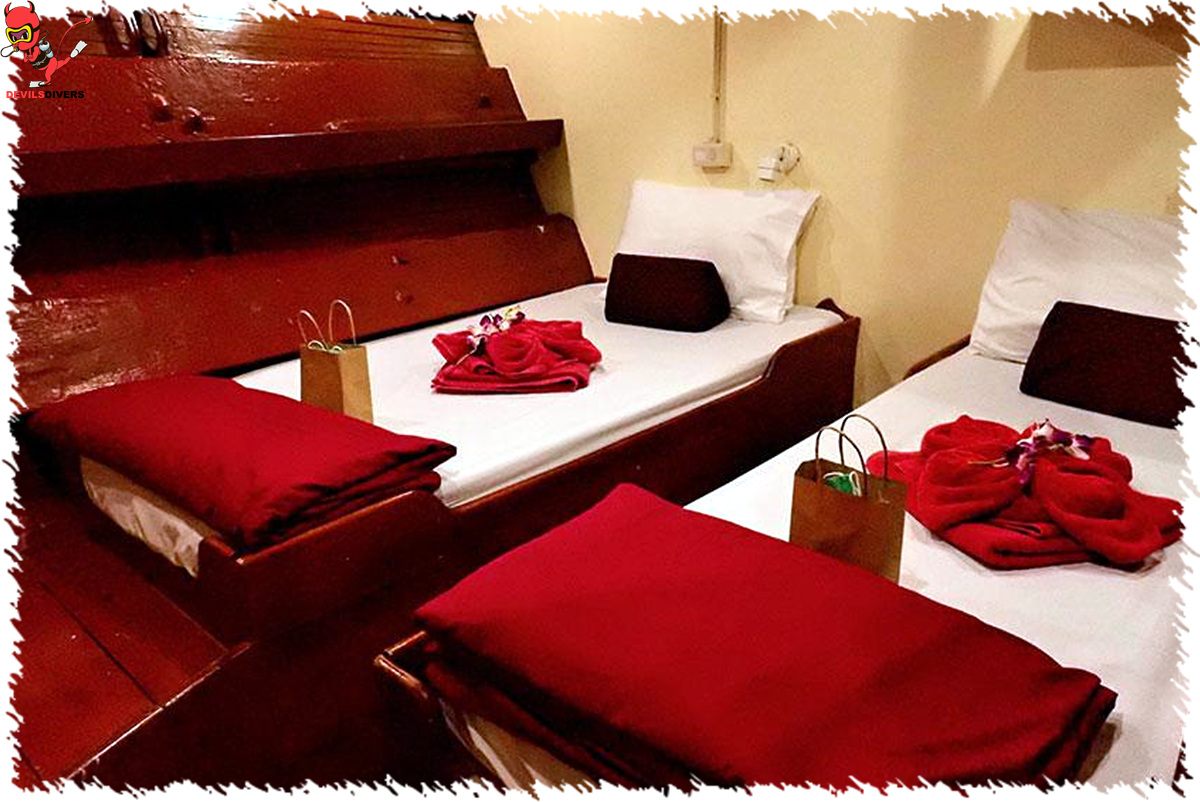 The Junk is able to comfortably welcome 18 divers on board. Accommodation is provided in two flexible double/twin cabins, two triple berth cabins, and two quad cabins that can sleep up to four divers in twin bunk beds. All cabins are equipped with air conditioning, fan and offer en-suite facilities.