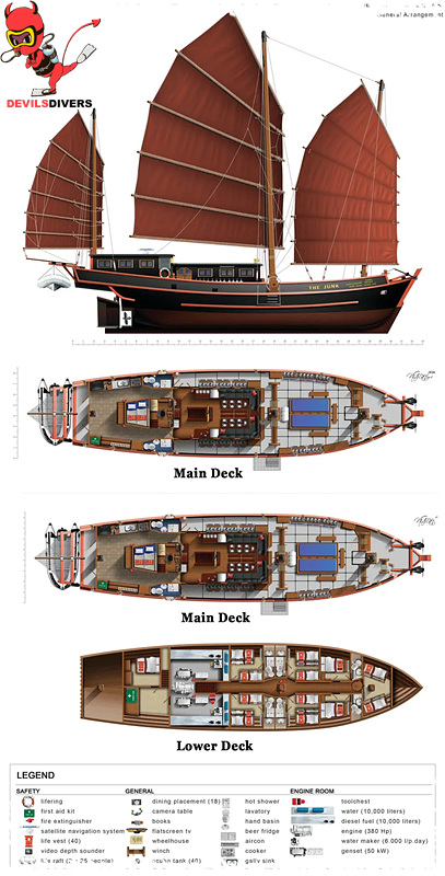 The Junk liveaboard is a stunning, historical 33m vessel that offers liveaboard diving holidays in Thailand. Originally built in 1962 as a sailing cargo vessel, she was completely overhauled and refitted in 1997 to the vessel she is today. Built from the