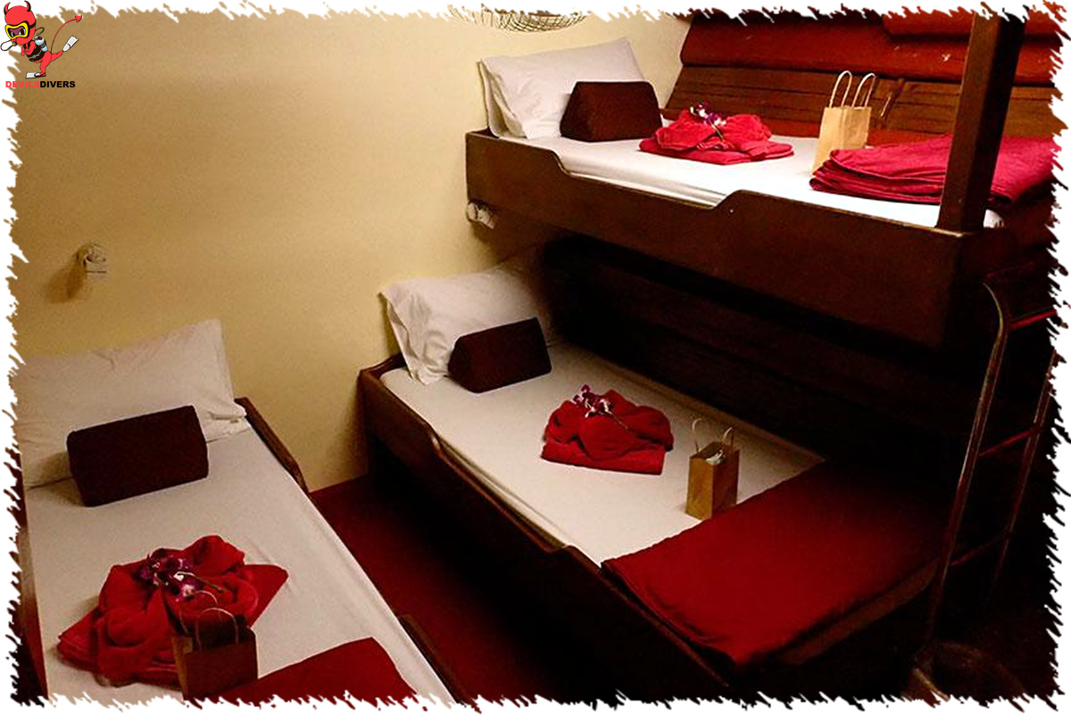 The Junk is able to comfortably welcome 18 divers on board. Accommodation is provided in two flexible double/twin cabins, two triple berth cabins, and two quad cabins that can sleep up to four divers in twin bunk beds. All cabins are equipped with air conditioning, fan and offer en-suite facilities.