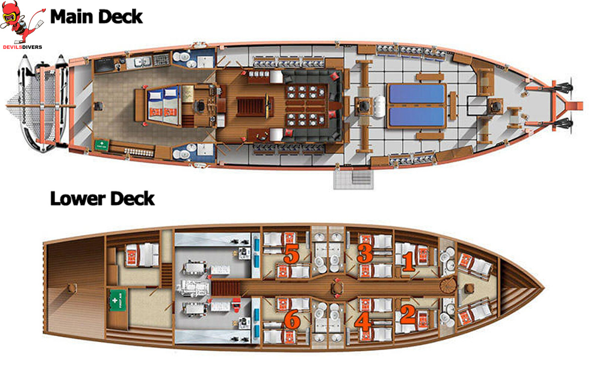 2 private double bed cabins which can convert into twin beds. All our cabins are fully air-conditioned and have their own hot water shower and toilet en-suite.