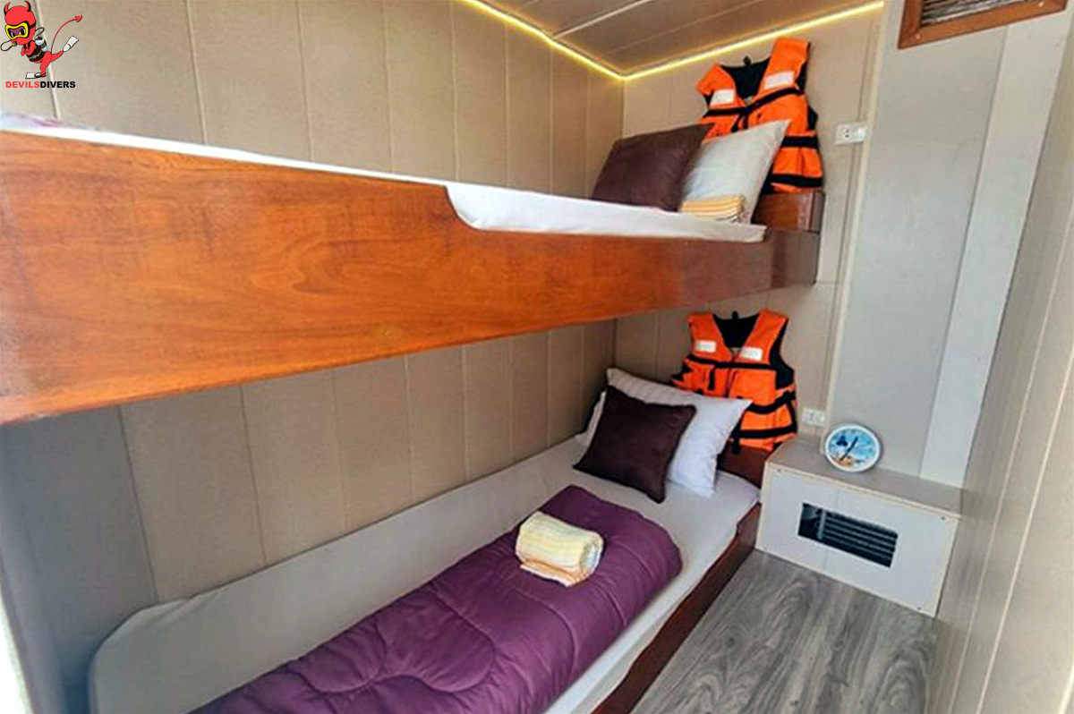 Budget Cabin 2 is located on the Main Deck. This has a shared bathroom and is furnished with an individually controlled air conditioning system. This cabin consists of 2 single bunk beds.