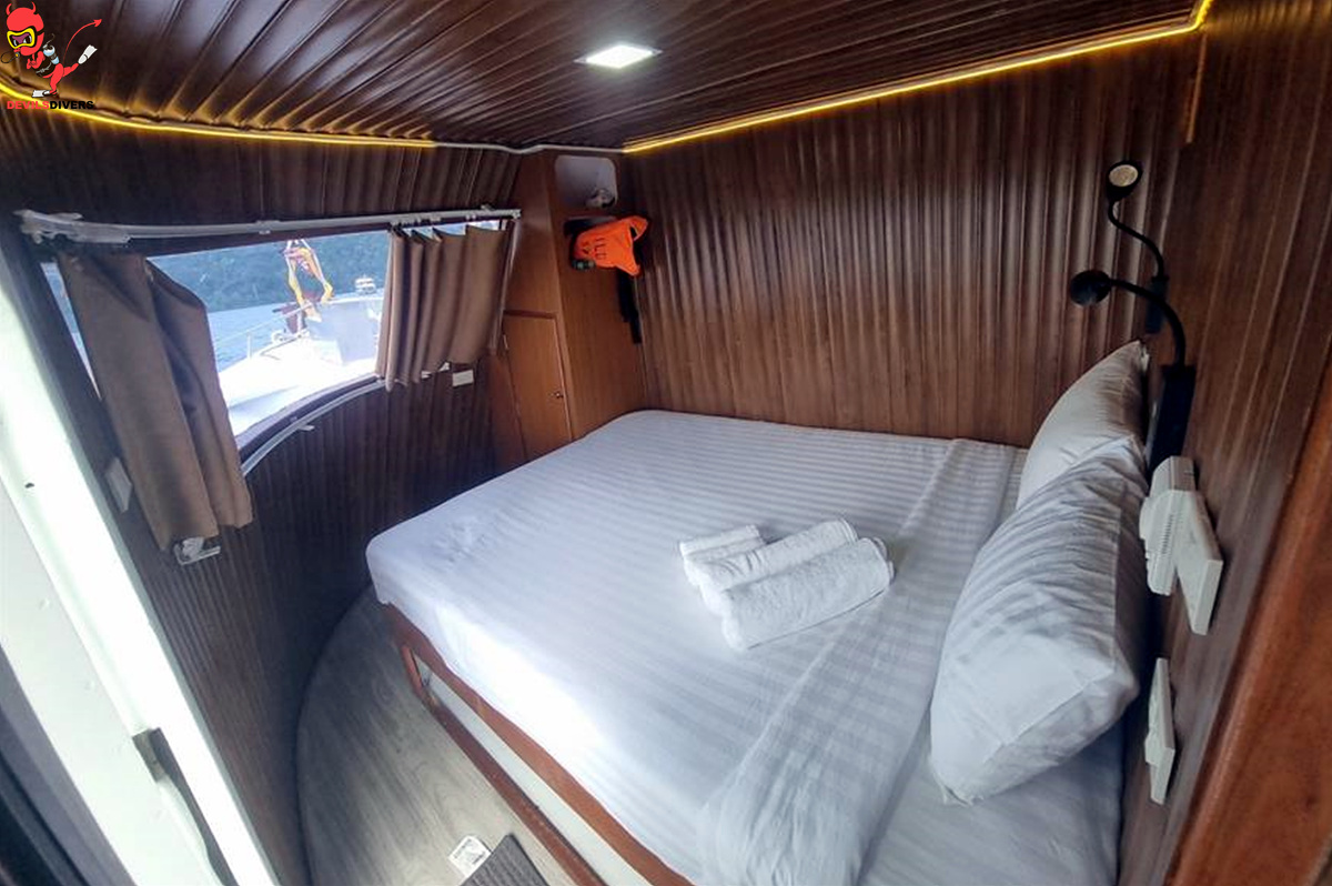 6 Deluxe Cabins are located on the Main Deck. These have ensuite bathrooms and are furnished with individually controlled air conditioning systems. Deluxe Cabins would have one double and one single bed that can accommodate up to 3 guests.
