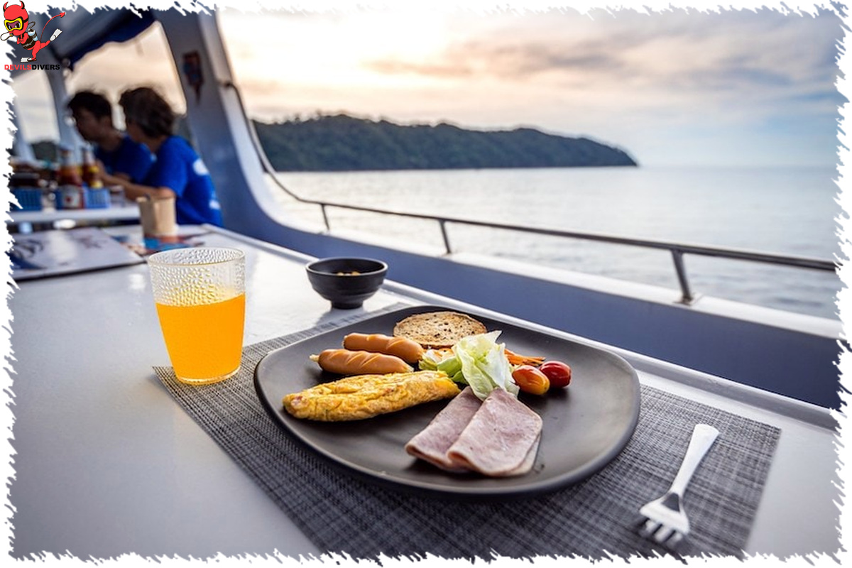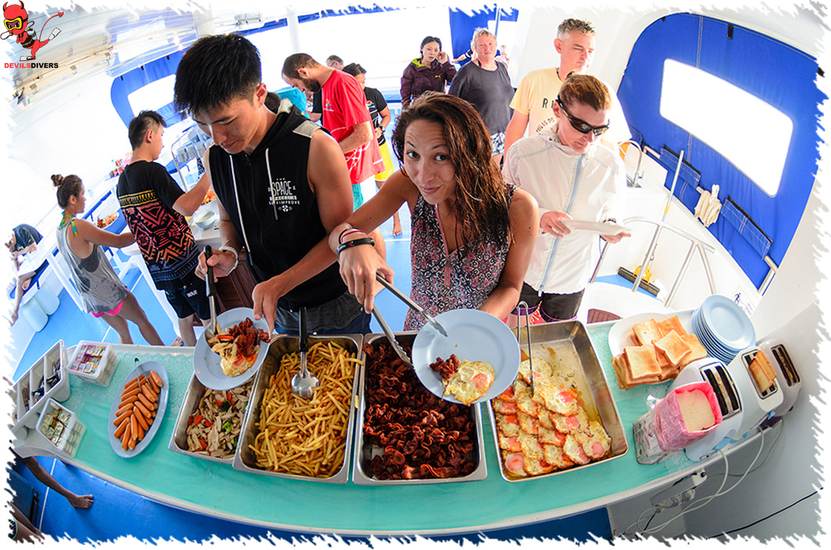 KSA Liveaboard is proud to offer the best tasting Thai-European Fusion Cuisine, freshly prepared by our onboard chefs on the whole Manta Queen Fleet. Our catering options can be adjusted for vegetarian/vegan divers as well. The use of Monosodium Glutamate is banned on all of our trips. If you are allergic to nuts or other food ingredients, please notify the staff during your check-in. All meals onboard are served freshly cooked from the onboard kitchen. Snacks and fruits are served in between dives.