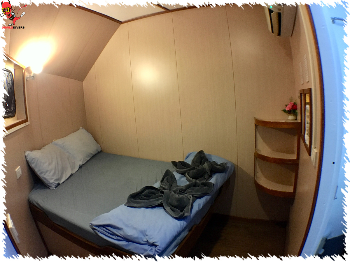 Comfortable air-conditioned cabin with one double bed and en-suite bathroom.
