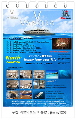| 태국 푸켓 스쿠버다이빙 시밀란 바노라 리브어보드 연휴 예약 (0) | 2024.10.29 |